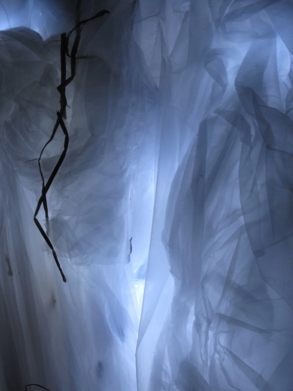 Rebecca Krinke’s exhibition of her June 2015 Northern Spark commissioned project - Dream Window - a surreal 4-poster bed suspended high in the girders of Mill City Museum’s Ruin Courtyard. Translucent layers of bedding illuminated from within - with hints of black feathers and straw - created a place and object of wonder (with a dash of terror). On the ground below, Krinke invited Northern Spark goers to contribute a dream (or nightmare) for a collective “dream book” that she and her team sewed together through the night. Almost 500 dreams were collected and they were on display at Rosalux Gallery in Minneapolis.
