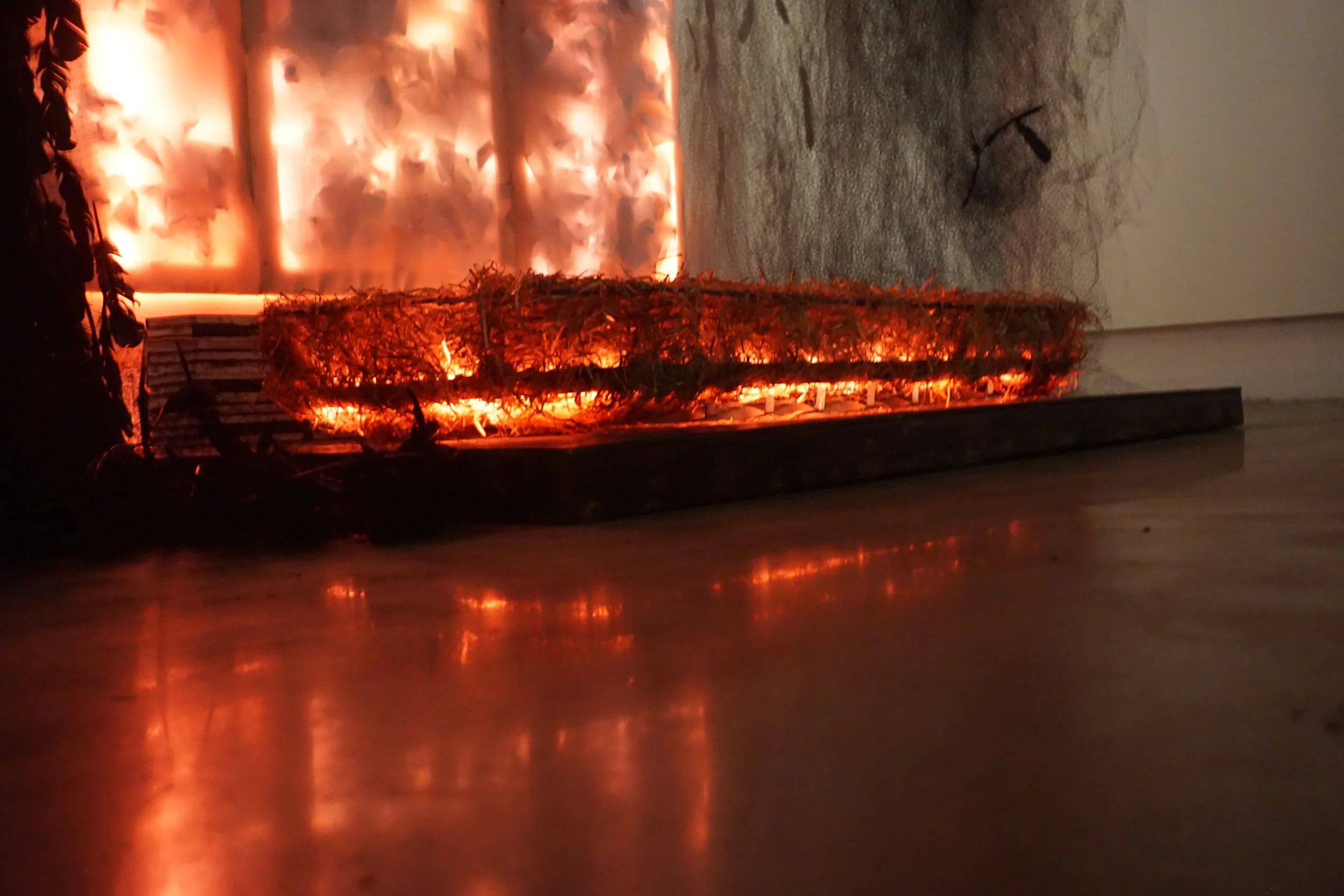 Reckoning creates a domestic-theatrical psychological space of wonder and terror. It continues Rebecca’s Bedtime series of sculptures - although here the room begins to take shape around the bed. Black feathered curtains swirl at window. There may be flames raging outside and fire inside too…or is this a dream about a fire? Stacks of Rebecca’s dozens of black bound notebooks are visible on the burned wood floor.