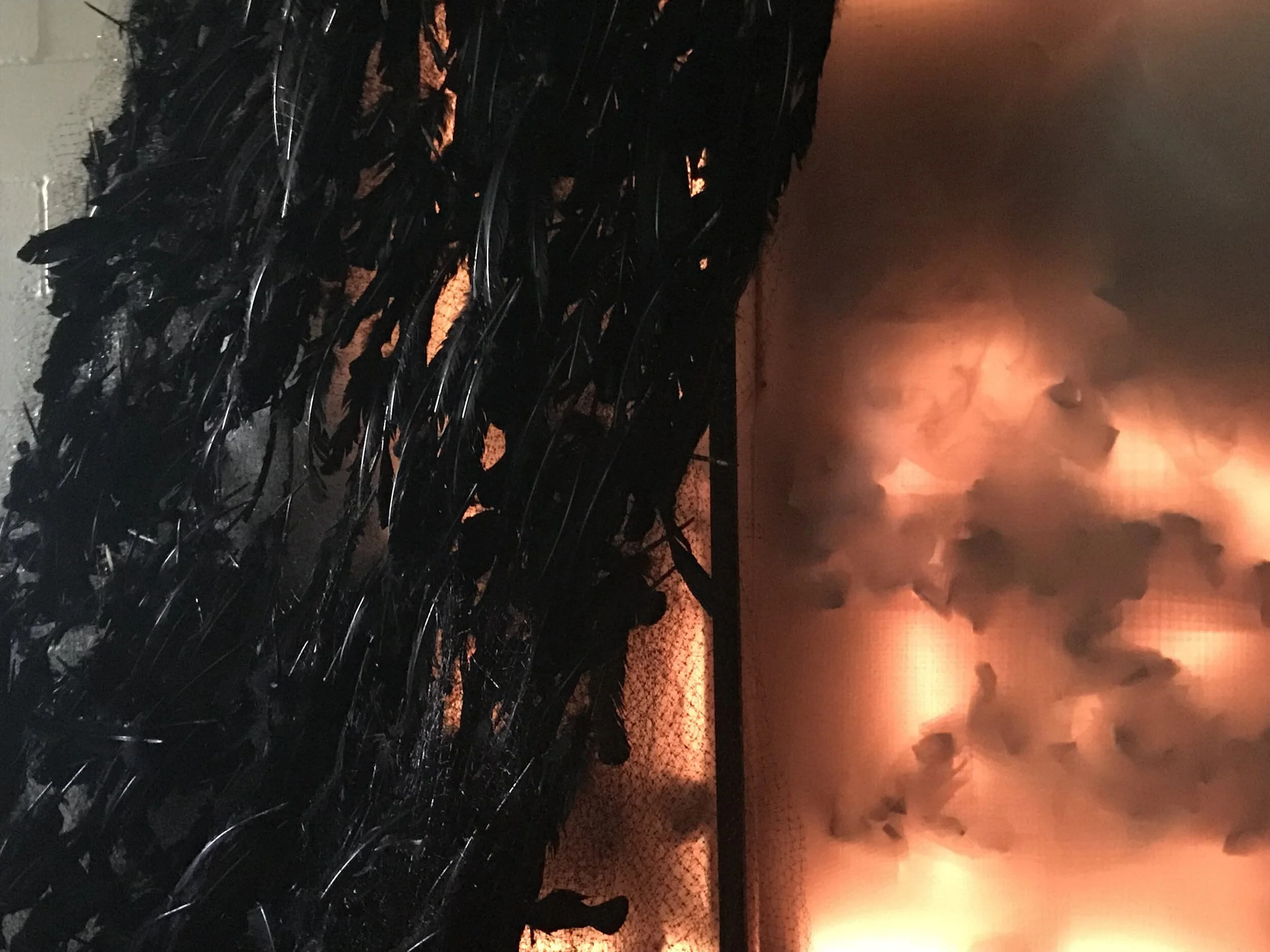 Reckoning, an installation-environment of wood (some charred), feathers, Rebecca’s personal notebooks, found objects (bed, doors), bird netting, lighting, and mixed media. Installed at Rosalux Gallery 2018.