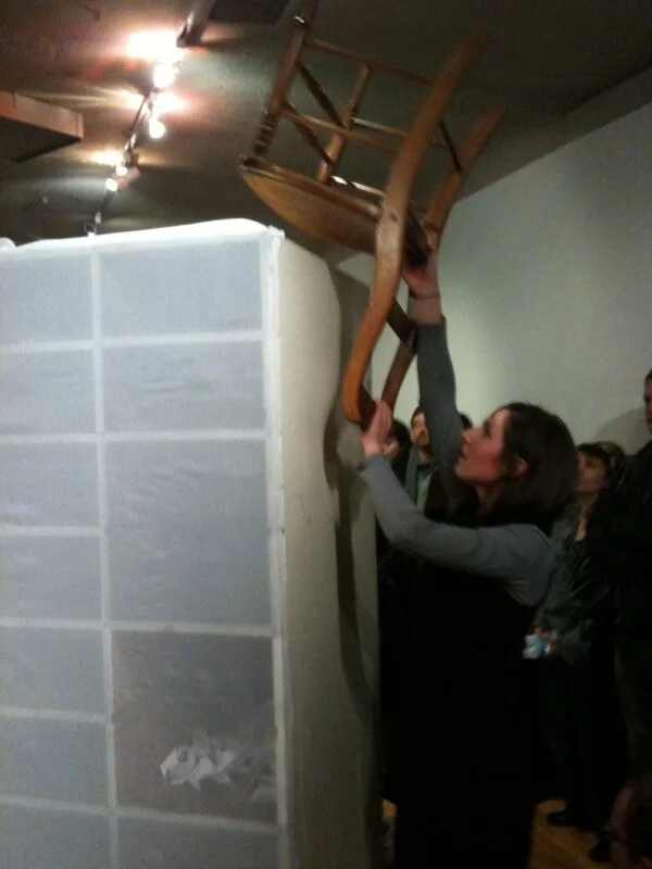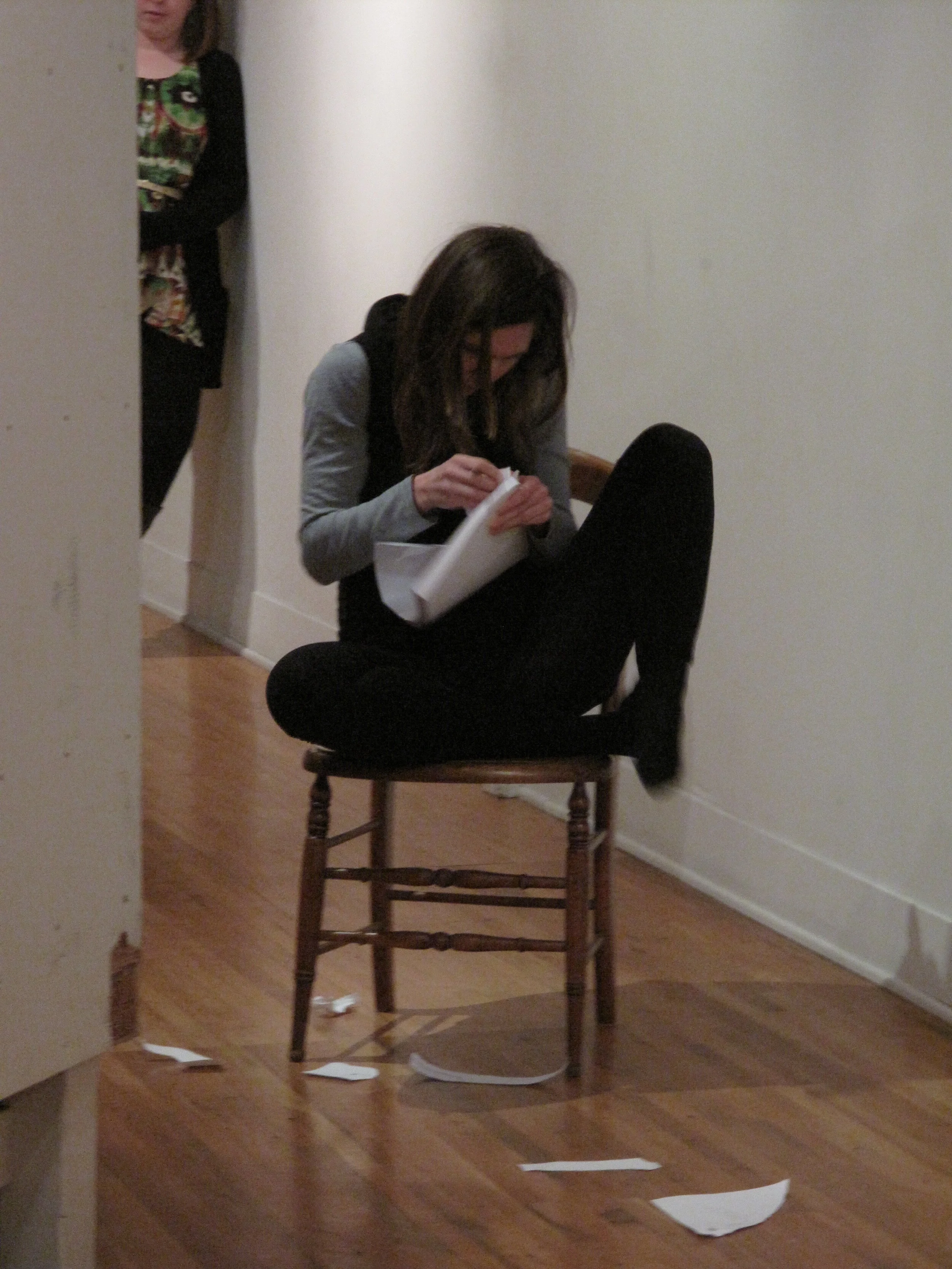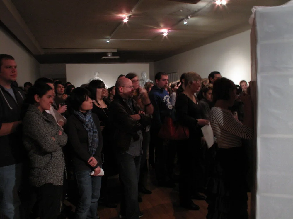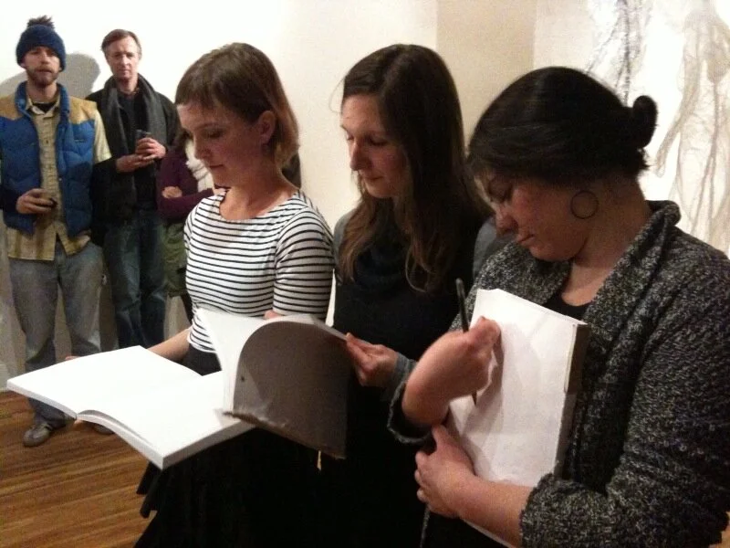 The Visitation performance was designed and performed by Anna Lawrence Bierbrauer, Paige Collette, and Amy Krautbauer. They were invited by Krinke to create a piece that responded to the sculptural environment, and their wordless performance was held twice, to large crowds, in the gallery. Bierbrauer, Collette and Krautbauer interpreted the massive cabinet of journals as a repository of heightened emotion. A struggle with secrets and burdens emerged as the performance’s key theme.