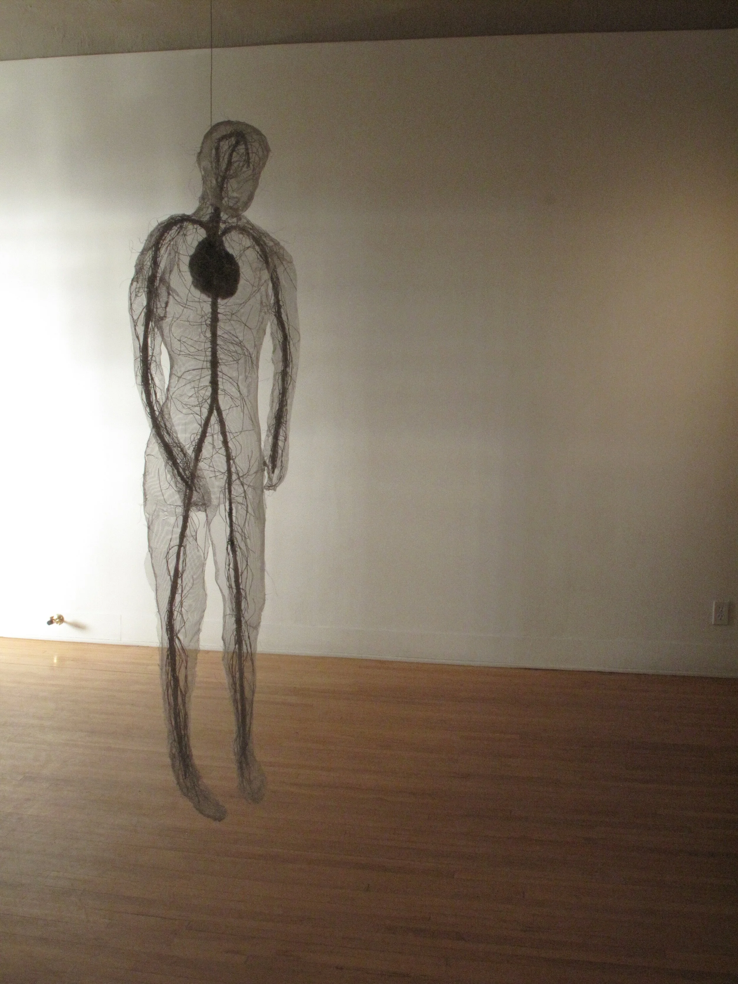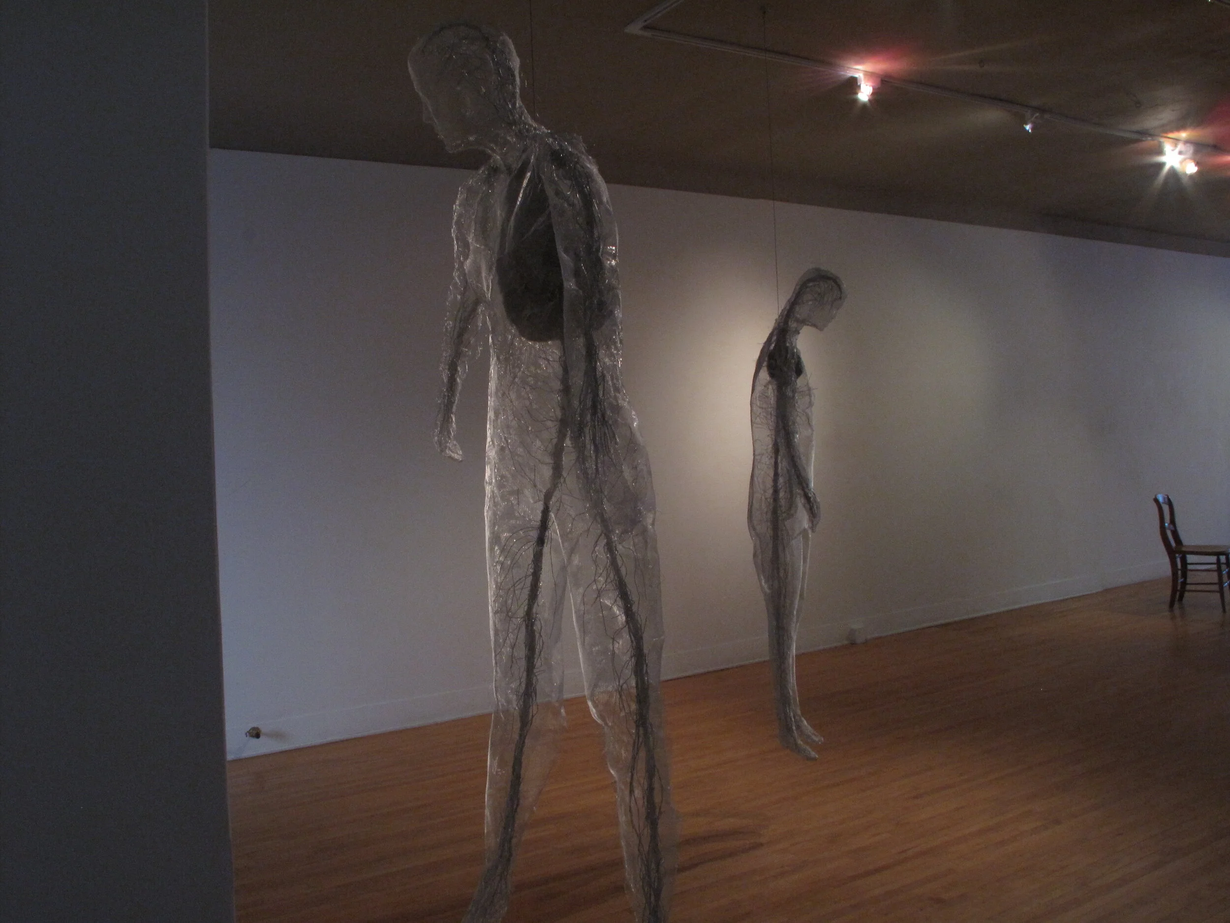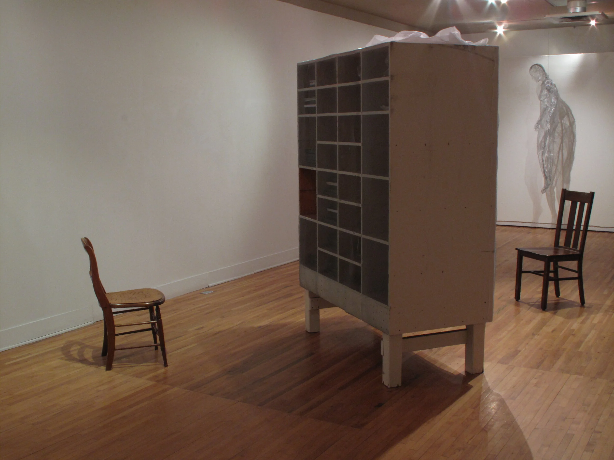 Visitation was a 2011 solo show, a performance, and the name of (ongoing) scheduled public excursions. In the gallery, Visitation was a sculptural installation that took over the entire space to explore themes of memory and repression. An immense old wooden cabinet was stuffed with black bound notebooks (Krinke’s journal-sketchbooks) and crumpled papers. The cabinet appeared to be completely shrouded in white translucent fabric; from the other side the notebooks are seen, but out of reach behind layers of screen. Three female figures made of screen and wire hover at the edges of the space, evoking qualities of insistent memories and emotions.
